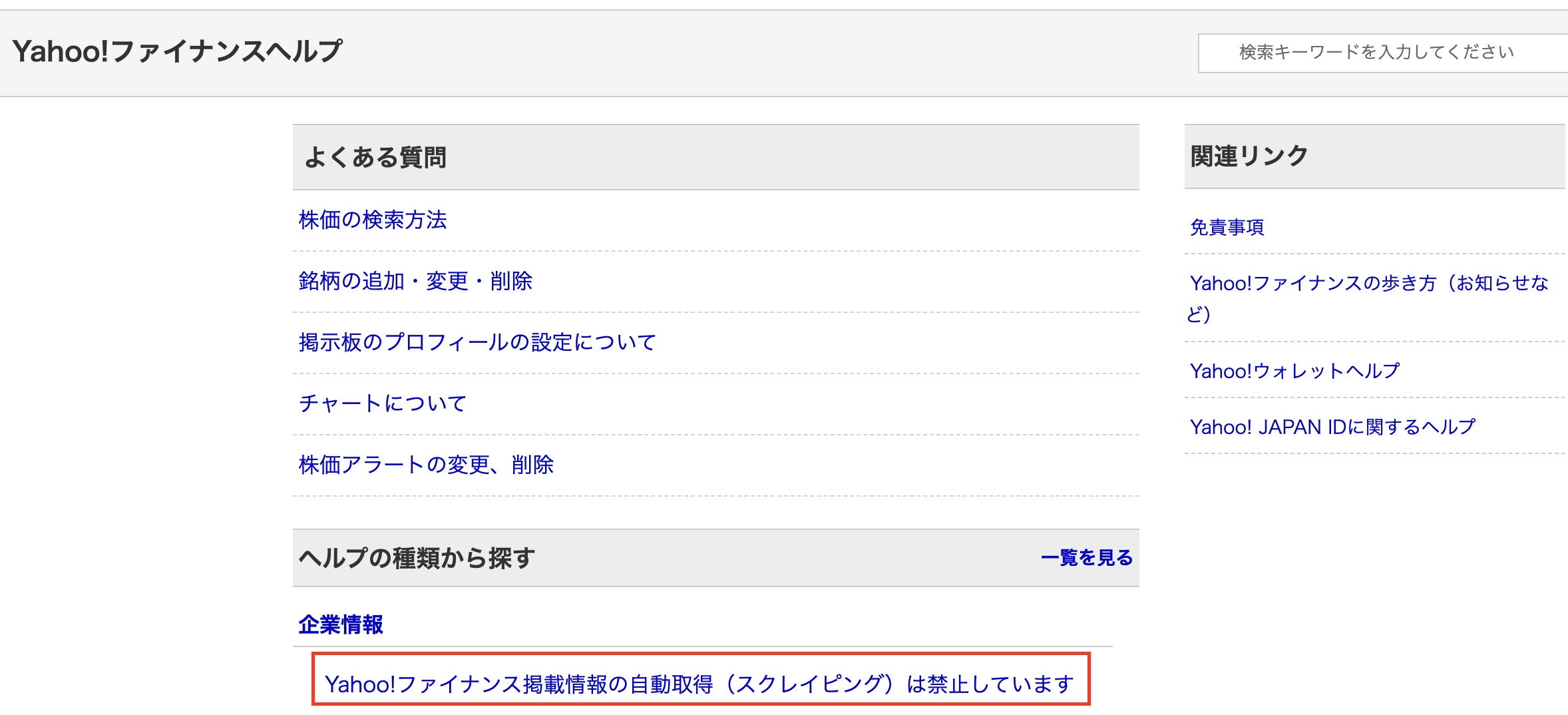 スクレイピングはサイトによっては禁止されている場合もあるので、右上のヘルプからYahoo Japanの利用規約をチェックします。