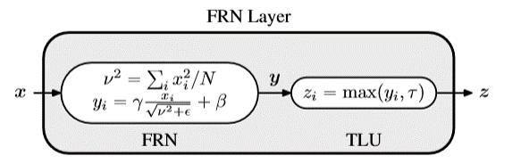 この論文では、下図の新しいNormalization FRNとActivation関数 TLUを提案