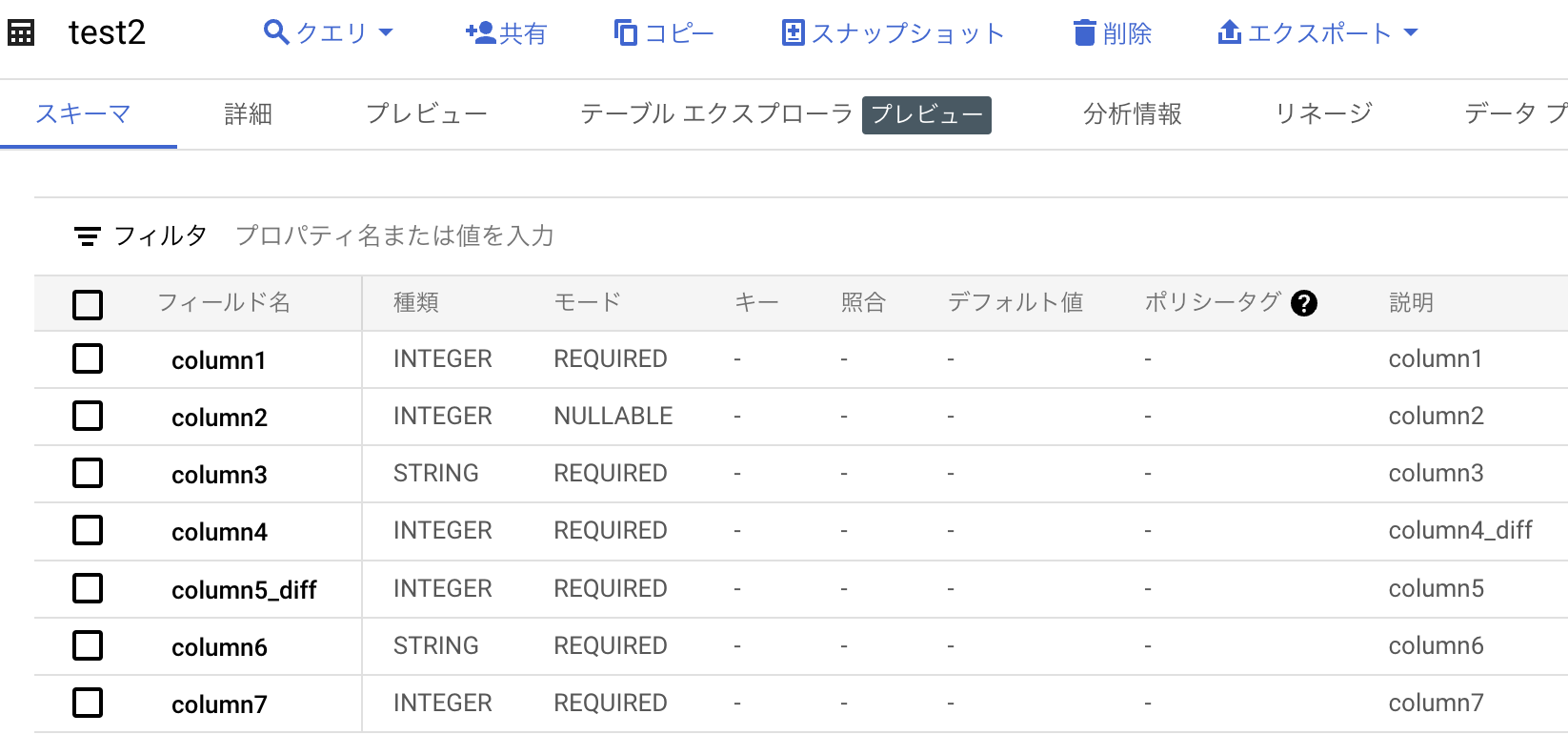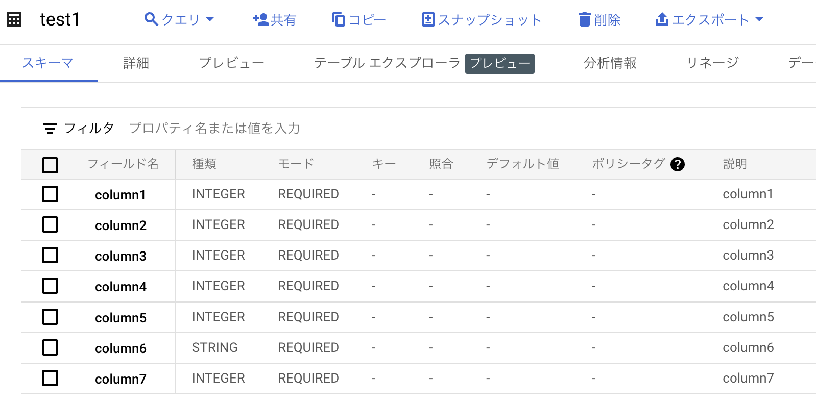 {'column1': {'type': 'INTEGER', 'mode': 'REQUIRED', 'description': 'column1'}, 'column2': {'type': 'INTEGER', 'mode': 'REQUIRED', 'description': 'column2'}, 'column3': {'type': 'INTEGER', 'mode': 'REQUIRED', 'description': 'column3'}, 'column4': {'type': 'INTEGER', 'mode': 'REQUIRED', 'description': 'column4'}, 'column5': {'type': 'INTEGER', 'mode': 'REQUIRED', 'description': 'column5'}, 'column6': {'type': 'STRING', 'mode': 'REQUIRED', 'description': 'column6'}, 'column7': {'type': 'INTEGER', 'mode': 'REQUIRED', 'description': 'column7'}}