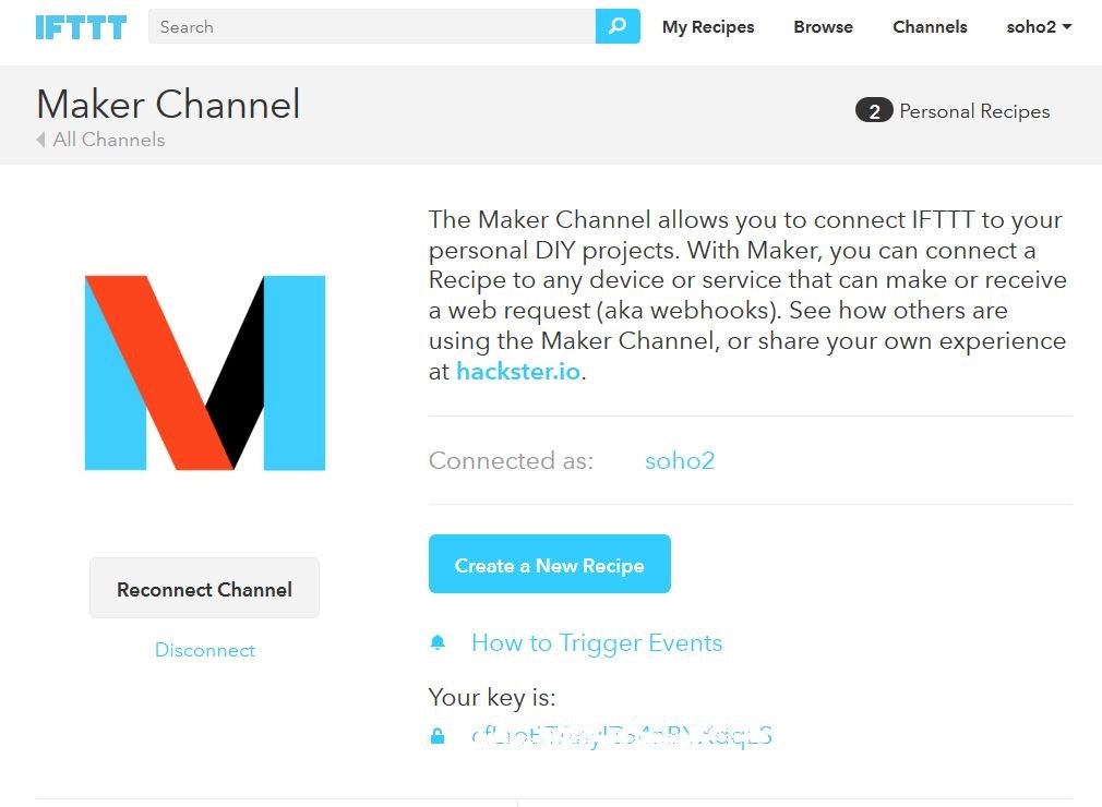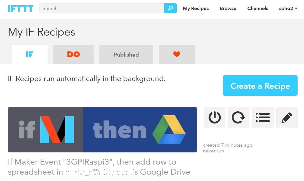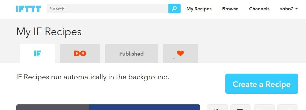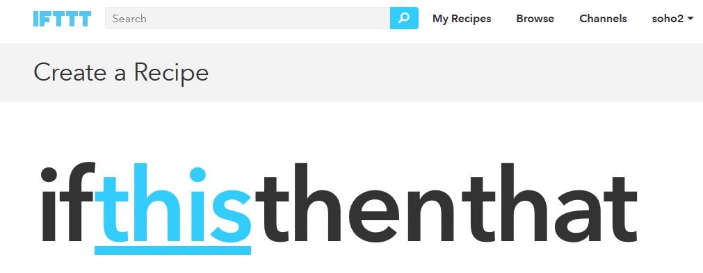 1.「IFTTT」でIFTTTアカウントを作成します。Topメニューの「My Recipes」をクリックし、次のように画面右下の「Create a Recipe」をクリックします。