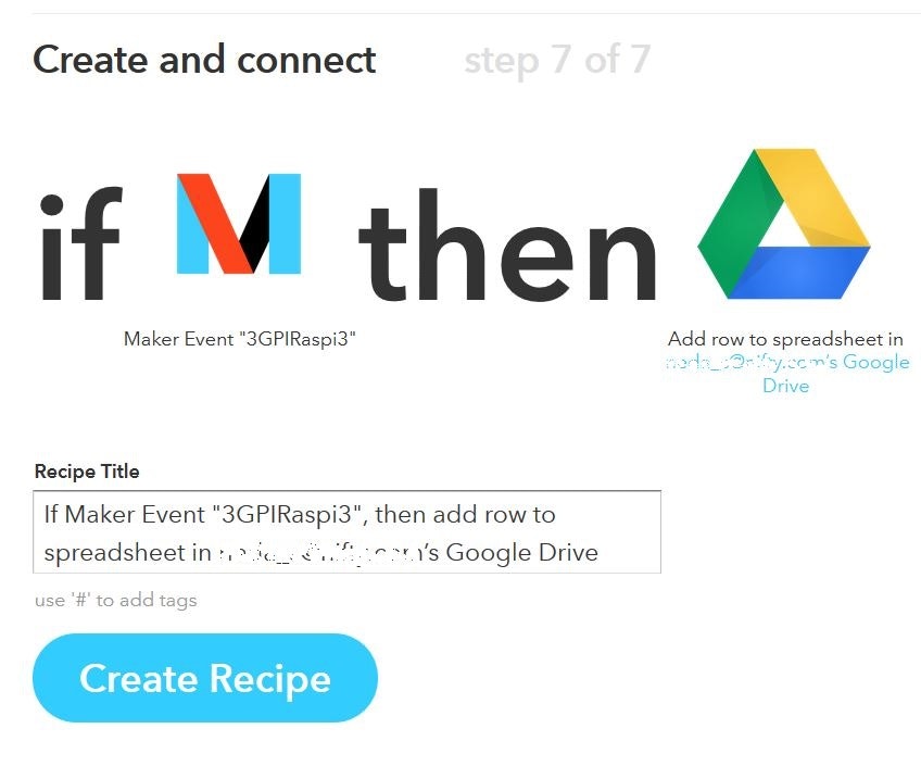 今回のIFTTTのレシピは、「this」の部分は、「3GPI+センサネットワークモジュール+Raspberry Pi 3によるセンサー情報の取得時」とし、「that」の部分は「GoogleドライブのGoogleスプレッドシートによるセンサー情報の取得時」とします。イベント名は「3GPIRaspi3」とし、Googleスプレッドシート名は「ALPSSensor」とします。