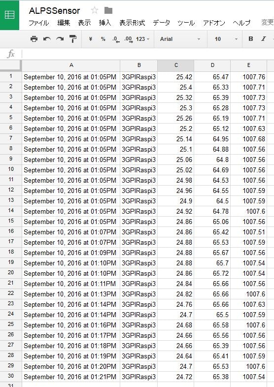 Googleスプレッドシートには、次のように温度、湿度、気圧が記録されています。