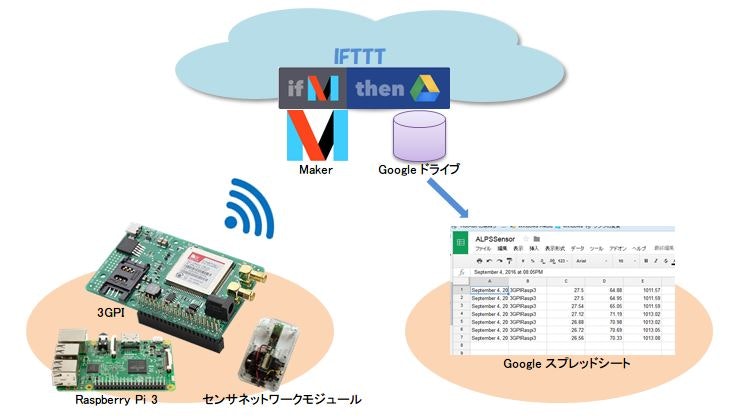 アルプスのセンサネットワークモジュールからBLEインタフェースを用いて取得した温湿度、気圧情報を、Raspberry Pi 3に搭載された3GPIを経由して、IFTTTにアップロードします。IFTTTでは、あらかじめ設定されたレシピに基づき、受け取った温湿度、気圧情報をGoogleドライブのGoogleスプレッドシートに保存します。ネットワークも含めた全体の構成図を次に示します。