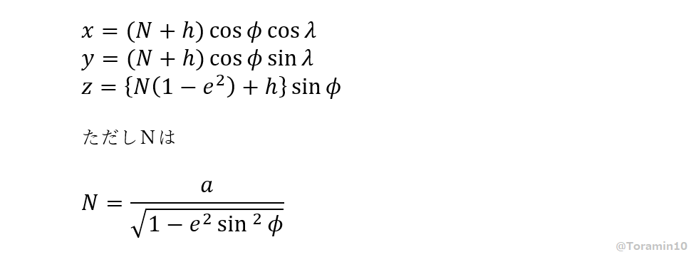 この記事ではGPSで測位された緯度経度の情報を,絶対的な三次元座標系における位置に変換する方法について解説しています.重要なポイントはただの三次元座標を得る手順を説明しているということです.