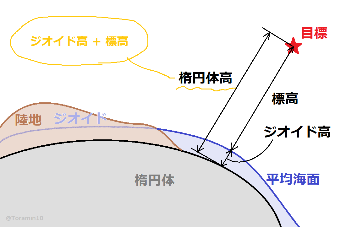 ここで注意が必要なのは,楕円体高はよく言う標高とは別物だということ.標高は平均海面から測った高度です.平均海面を陸まで伸ばしたラインをジオイドといい,標高は目標物とジオイドの間の距離だといえます.そんで楕円体とジオイドの間の距離をジオイド高っていうんですね.つまり楕円体高は標高とジオイド高の和で表せるってこと.ややこしいね.