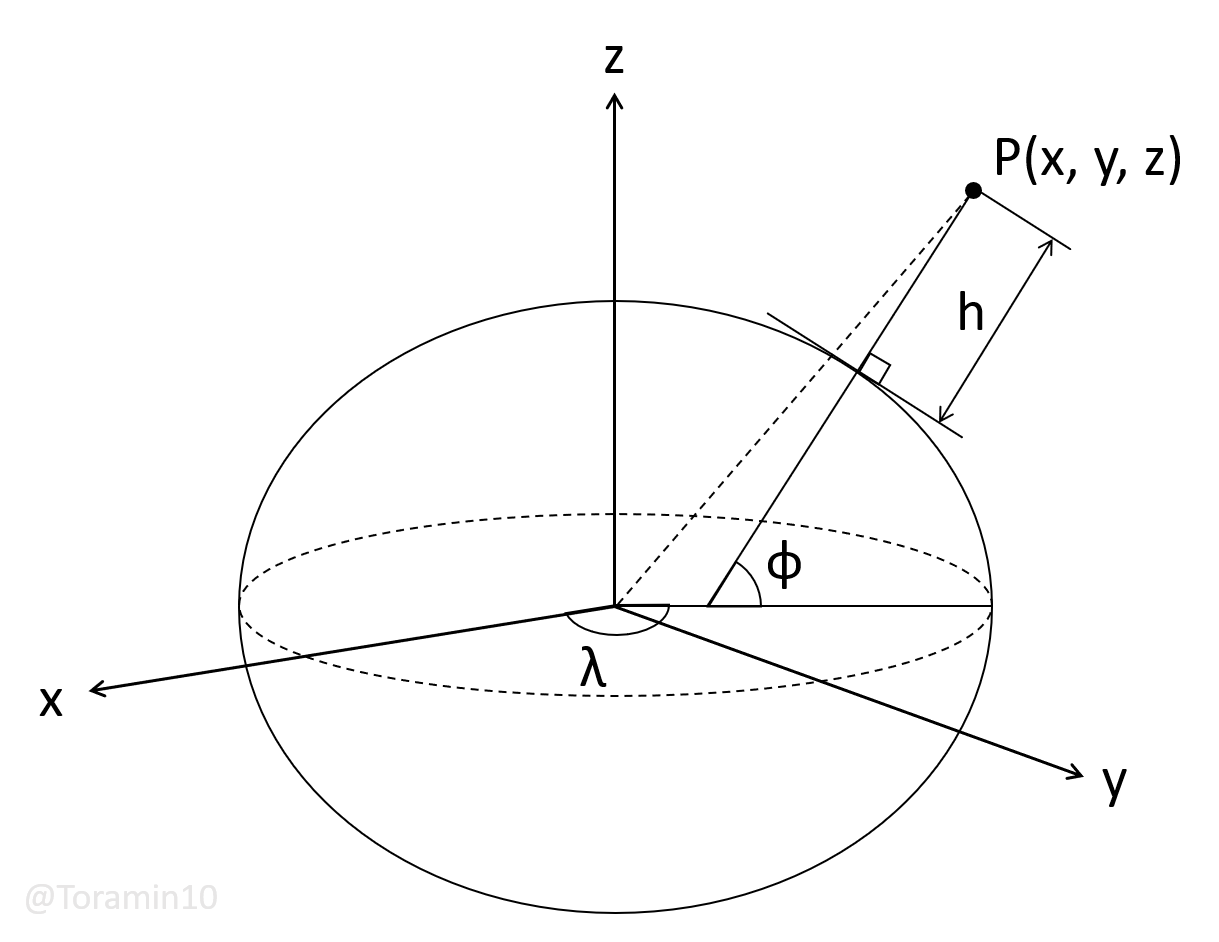 緯度Latitude φ, 経度Longitude λ, 楕円体高 h, あと点Pの座標x, y, zです.中央の楕円体が地球ですね.この楕円体にGPSはWGS-84を使っているというわけです.