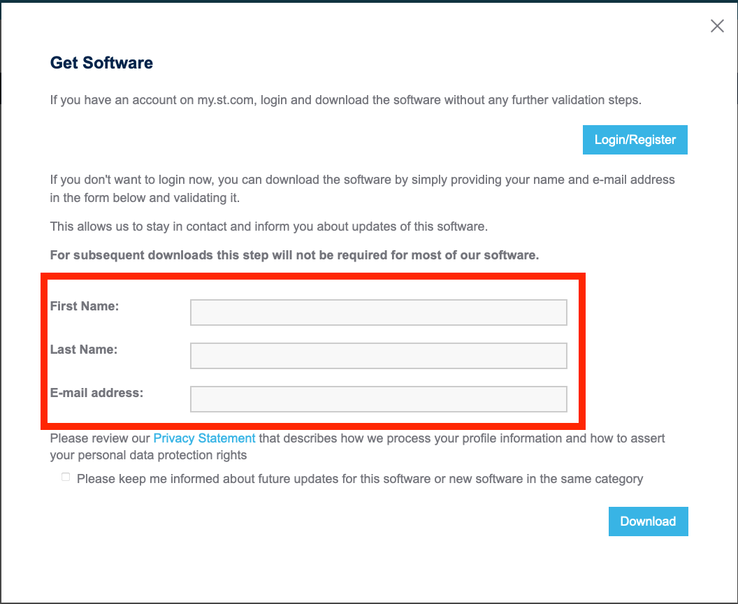 ライセンスの許諾とユーザ登録のダイアログが表示されますので、確認・必要事項を入力して「Download」ボタンを押下します。