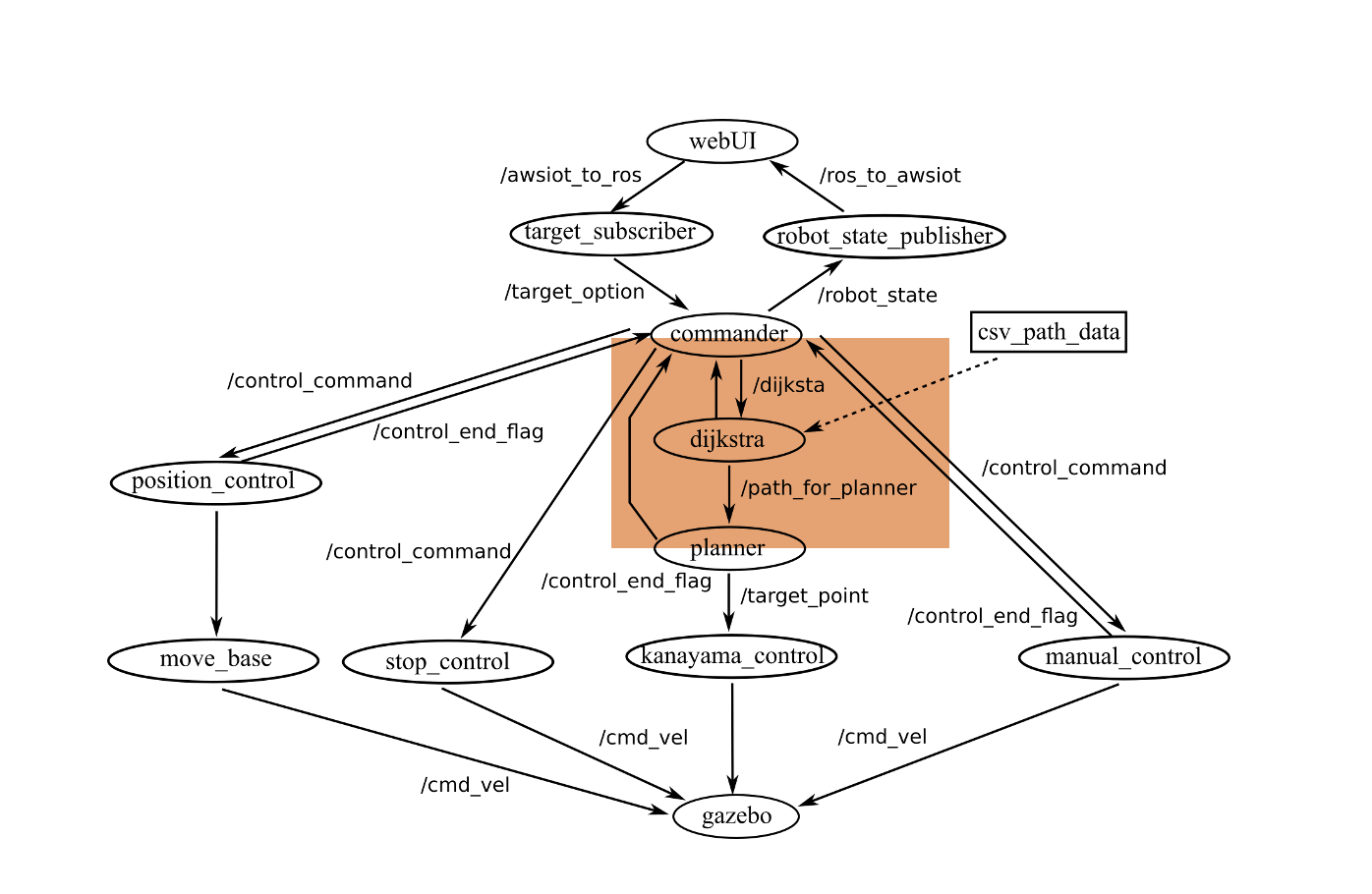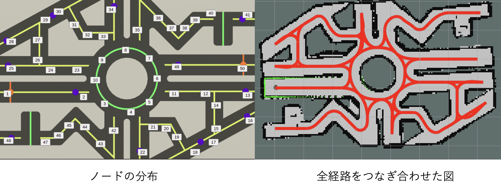 - ダイクストラ法で導いたノードの順序通りに、経路を繋ぎ最適経路を生成する。(ノード間の経路はあらかじめ最適制御で計算されていて、離散化された座標、各座標でのロボットの目標速度、目標角加速度がcsvファイルの形式で格納されている。)