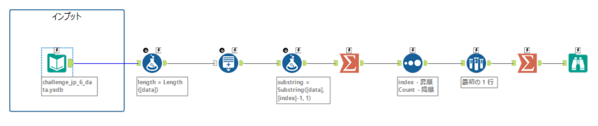 data列の各値は同じ文字数であり、n文字目の文字を見て最頻の文字を採用していくことで、あるメッセージが浮かぶようになっている。それを解読するために以下の手順でフローを構築した。