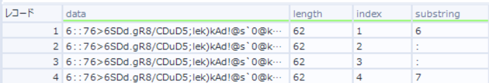 フォーミュラツール :substring()を使用して、data列の各値に対して一文字ずつ抽出を行う。