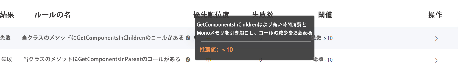以上の両者の使用には大規模な検索トラバーサルが含まれ、CPUの大規模な計算アセットが占有されるため、開発チームは関連する呼び出しを可能な限り減らすように努める必要があります。Updateのような頻繁に呼び出される関数に表示されないように、コールの結果をキャッシュすることを試すことができます。また、これら2つの関数については、呼び出しごとにMonoメモリが割り当てられないように、開発チームがList型の参照をパラメータとして受け入れるバージョンを使用することをお勧めします。