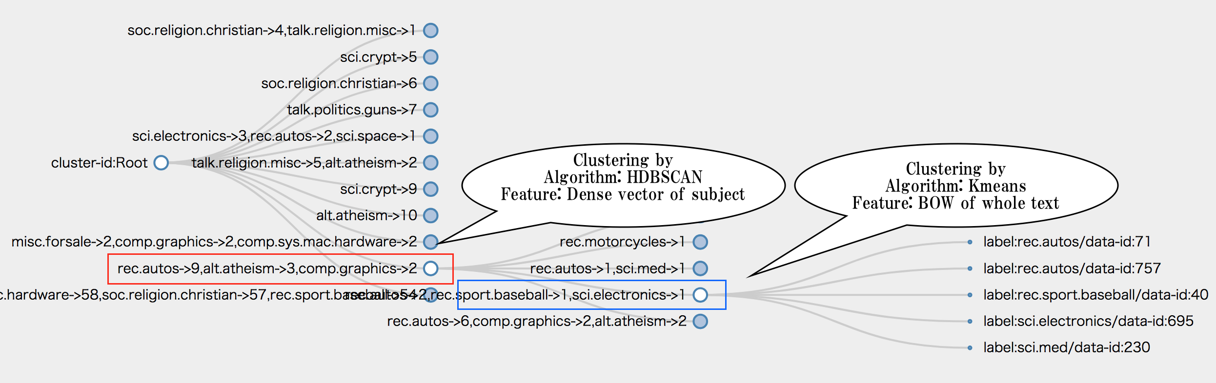 - クラスタリング後にD3.jsでツリー構造を可視化するメソッド付き