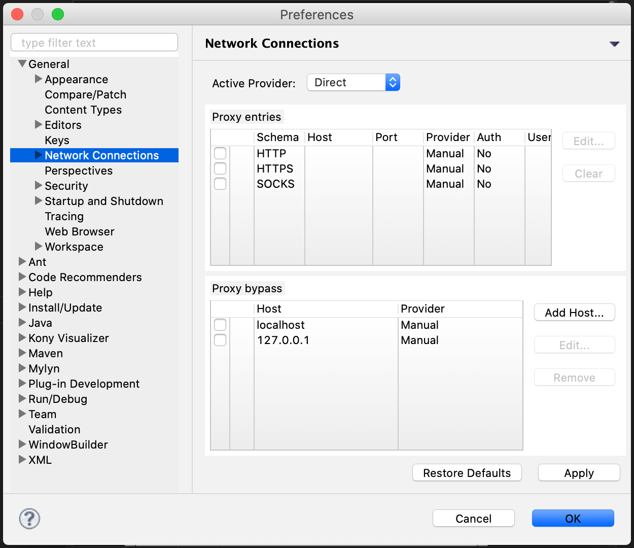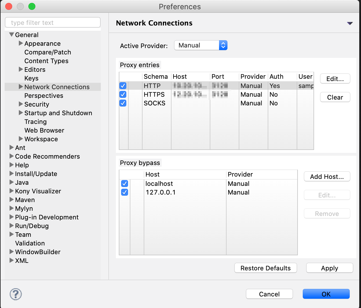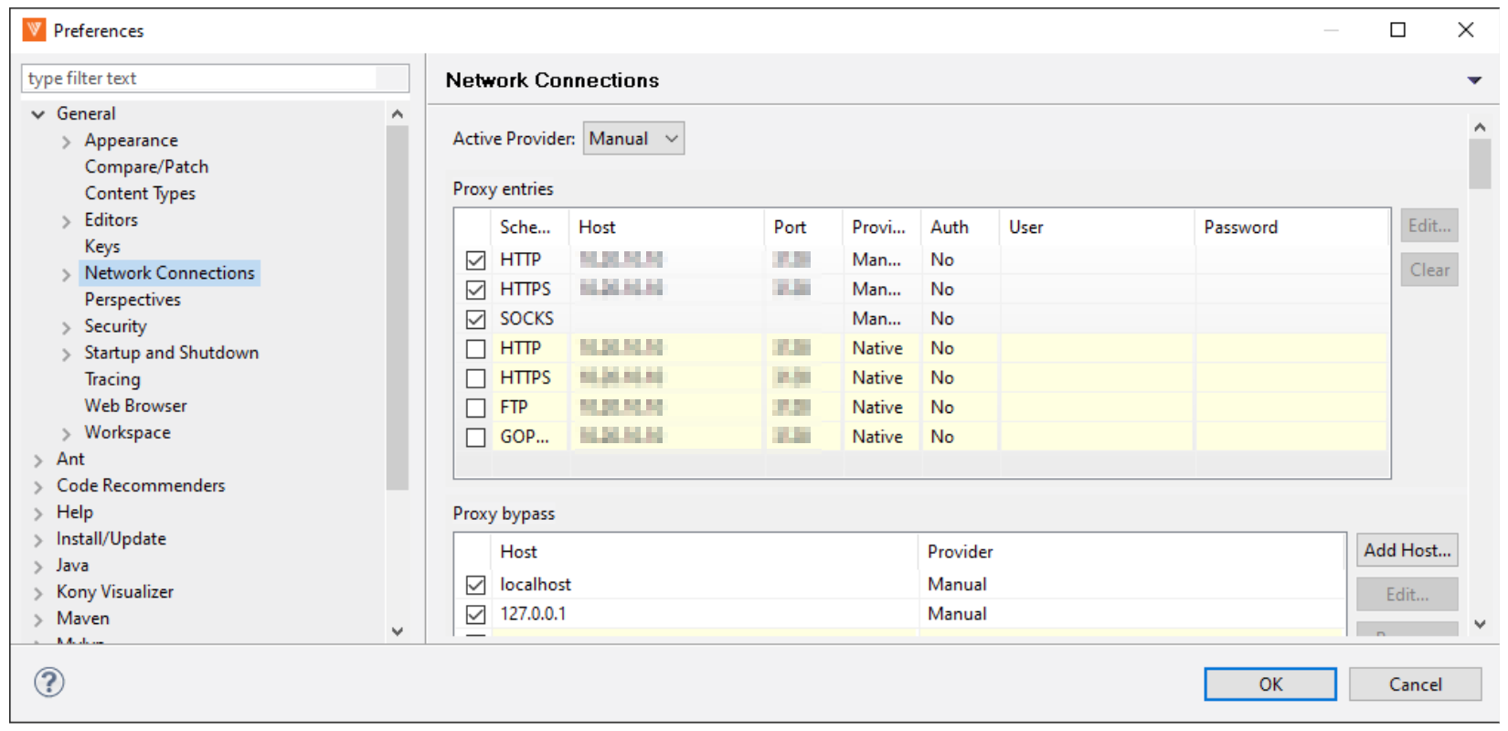 Window > Preferences > General > Network Connections - ここでkony visualizer のプロキシ設定を行う