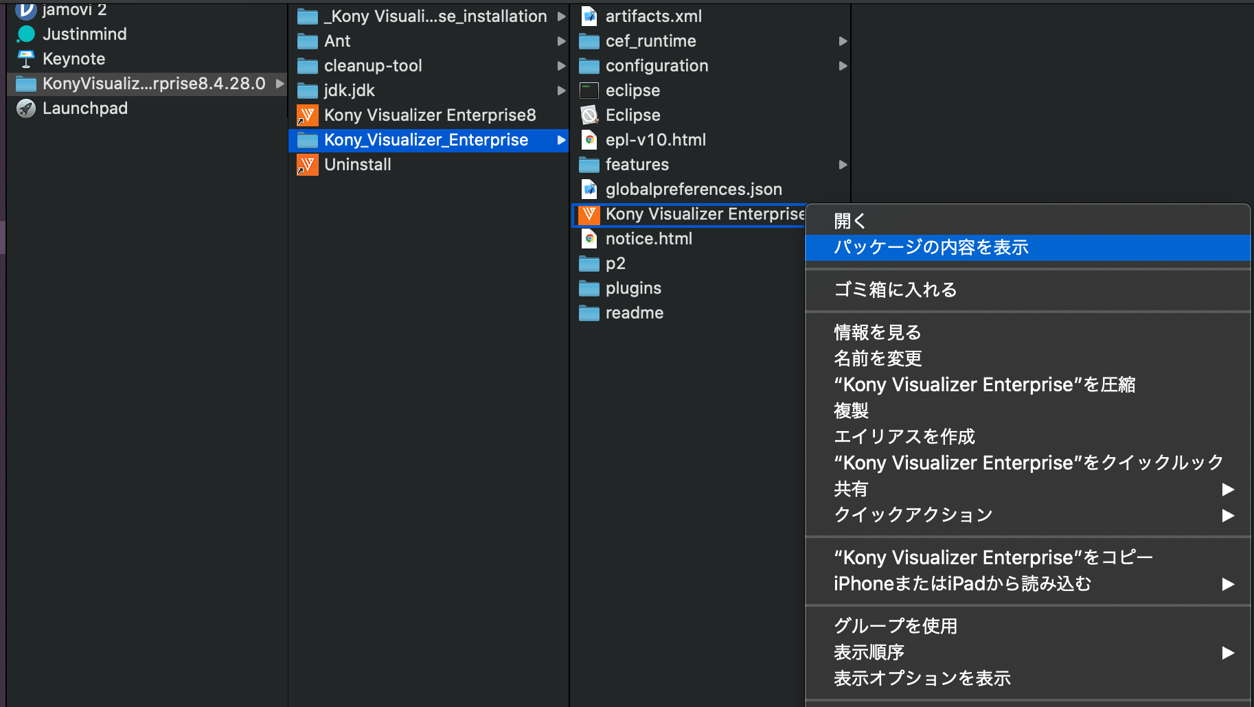 Konyのインストール先を Finderで開き、_Kony Visualizer Enterprise_を右クリックして、パッケージの内容を表示を選択する