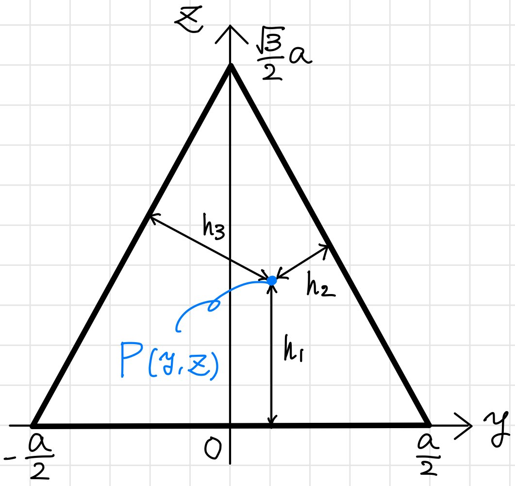三辺の方程式は$z=0, \; y+\dfrac{z}{\sqrt{3}}=\dfrac{a}{2}, \; -y+\dfrac{z}{\sqrt{3}}=\dfrac{a}{2}$であるから,点と直線の距離の公式より
