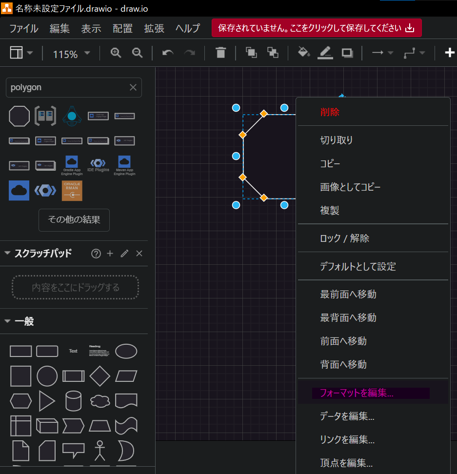 それでも描画したい場合、一つの選択肢としては下記のように「Polygon」を配置して、右クリック→フォーマットを編集、で端点を編集することで行えます。