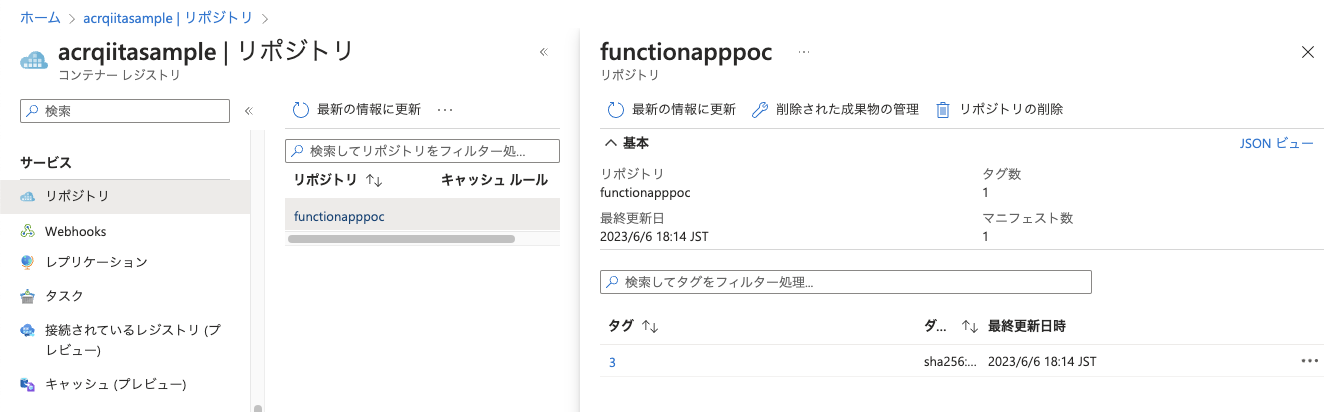 ACRのリポジトリを見ると、Pipelineの中でBuildされたImageがpushされています。
