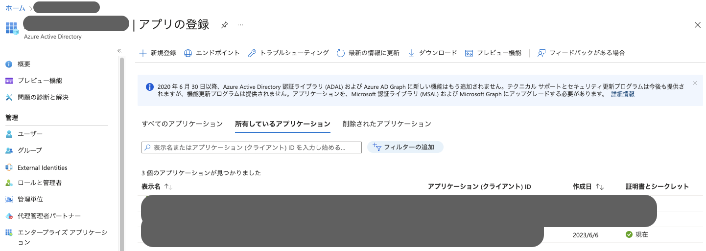 AzureADの「アプリの登録」画面におけるアプリケーション一覧に、作成したサービスコネクションが表示されます。隠してるところだらけで分かりづらくて申し訳ない......