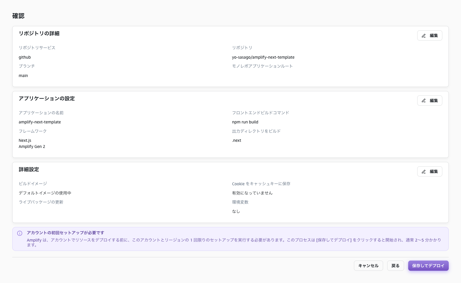 - GitHub アカウントの認証を行い、main ブランチを選択します。特に他の変更は行わずに次へ進み、保存してデプロイ をクリックします。