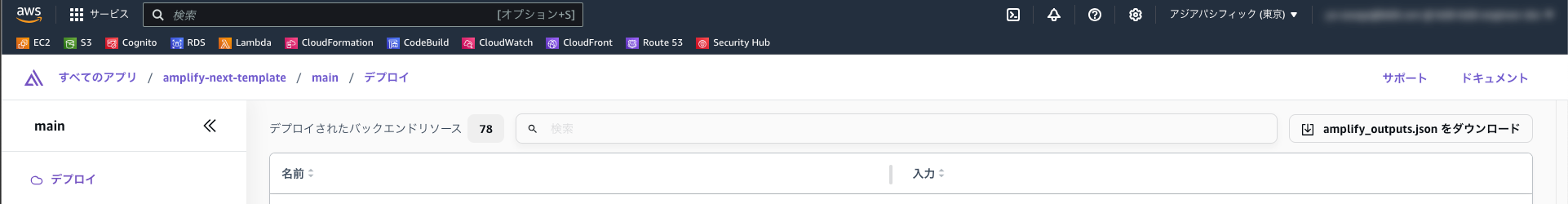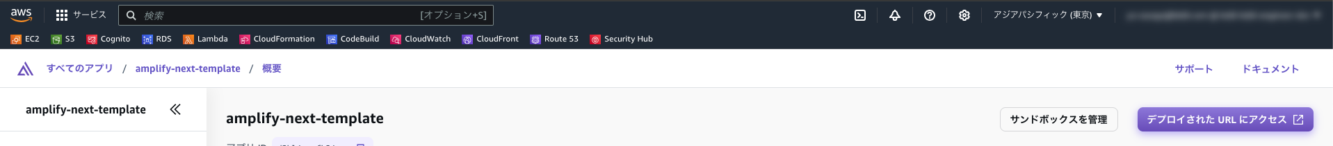 - AWS コンソールにログインし、Amplify サービスへ移動します。