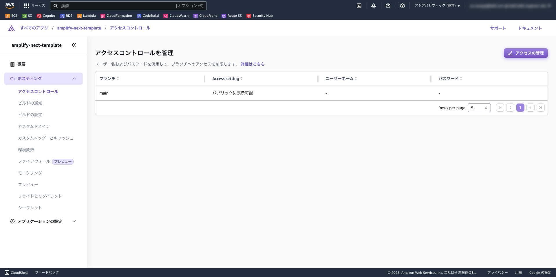 AWS コンソール → Amplify → 対象アプリケーションの ホスティング → アクセスコントロール を開きます。