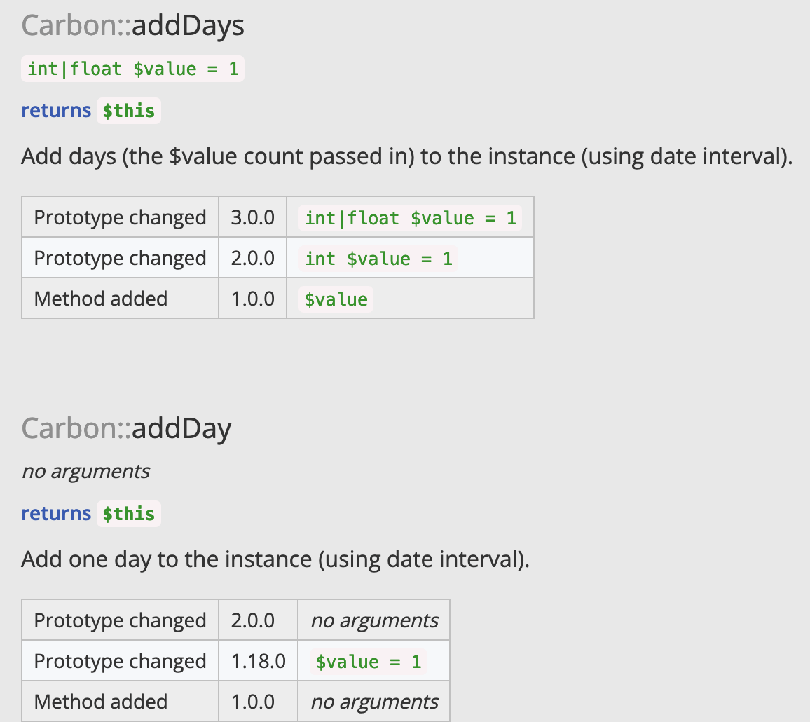 まずは複数形のaddDaysメソッドではint|float $value = 1と書いてありますね。納得できます。