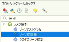 QGISのプロセッシングツールボックスの検索窓に zonalなどを入力すると、[ゾーン統計量ツール]がヒットしますので、こちらを起動します