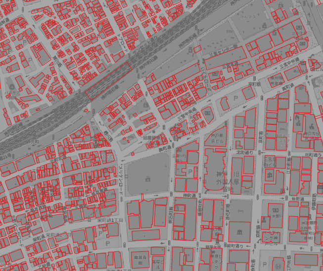 今回は三ノ宮エリアでbuilding = yesのwayデータを引っ張ってきます。サンプルはこちらです。