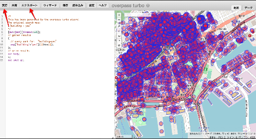サンプルコードを表示させたら、お好きなエリアに移動後、[実行]を押します。ちょっとサイズが大きいとツッコまれますが、[OK]を押して、[エクスポート]→GeoJSON形式でダウンロードしましょう。