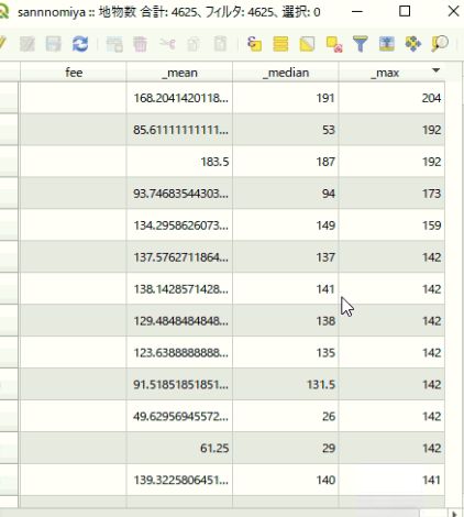 これで実行してみると、建物矩形データの属性右端にmean,median,maxなどの項目が計算結果として追加されます。