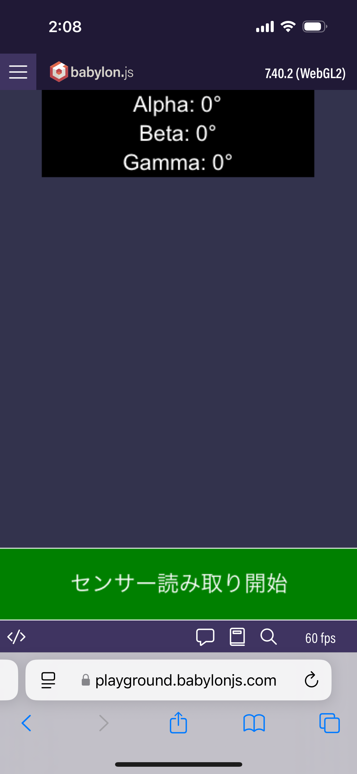 アクセスの許可をすると、画面の上部に表示している、alpha,beta,gamma の値が変わるようになりました。アクセス成功です。
