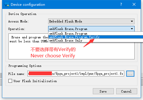 "Operation"列をダブルクリックすると次のDevice Configurationダイアログが開くので"Access Mode"、"Operation"欄を次のように設定します。"File name"には先ほどの*.fsファイルを指定します。