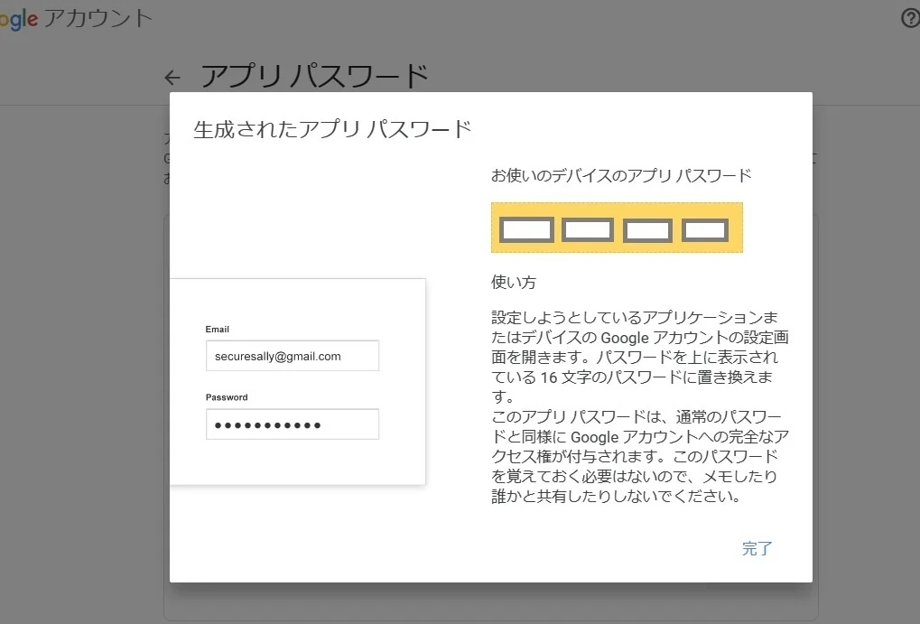 ここで生成したアプリパスワードを、Gmailサーバーへのログインパスワードとして使用します。