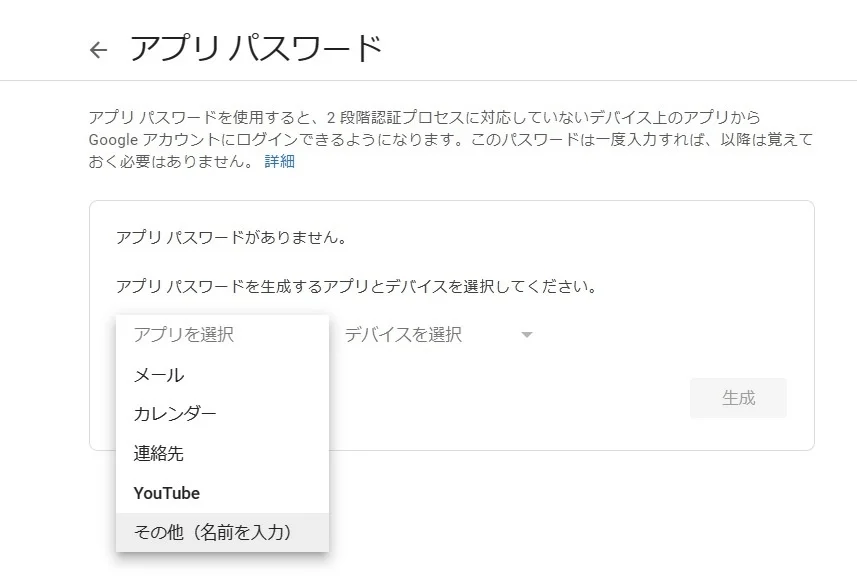 アプリ選択で「その他(名前を入力)」を選択して、アプリ名を入力し、生成ボタンを押すと、16文字のアプリパスワードが生成されます。