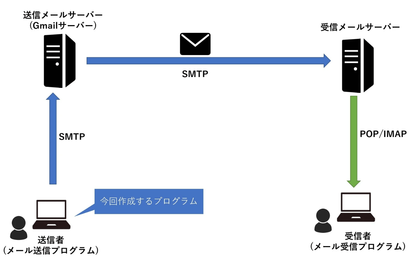 メールの送信には、SMTP(Simple Mail Transfer Protocol)というプロトコルが使用されます。ちなみに、このSMTPは、送信者(メール送信プログラム)と送信メールサーバとの間だけでなく、送信メールサーバーと、宛先の受信メールサーバーとの間でも使用されます。