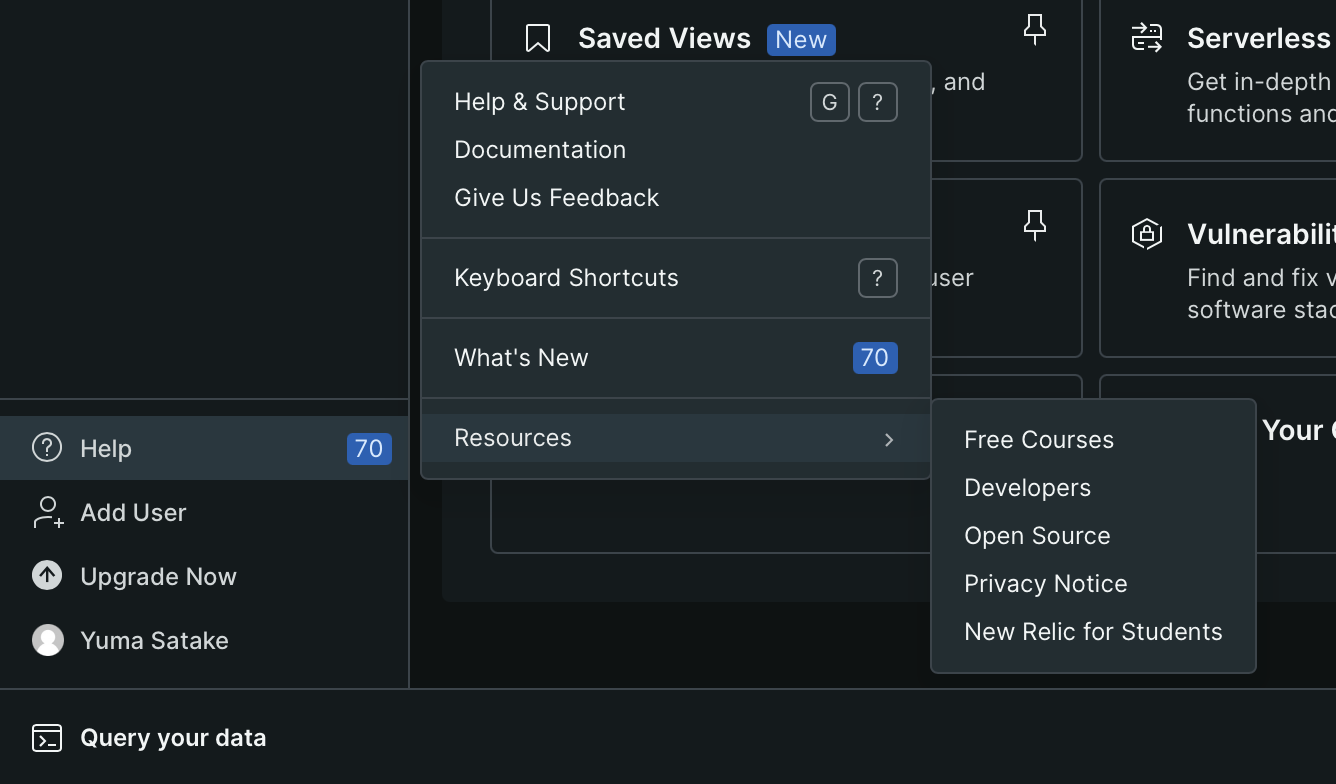 サイドバーのHelp > Resources > New Relic for Students