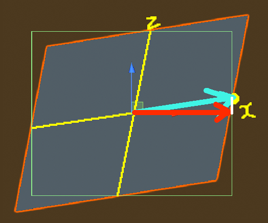 通常であればこれらは重なるのですが、図のように歪められた図形ではオブジェクトの向きと座標軸の向きが一致しないことがしばしばあります。