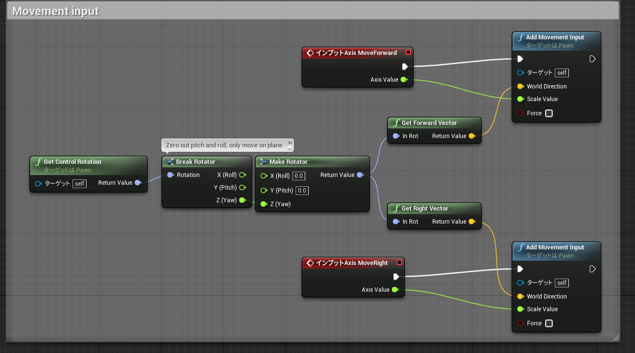 AddMovementInputでキャラクターの移動を行った後、進行方向ベクトルとカメラの右ベクトルから内積を計算しカメラの回転量を求めます。