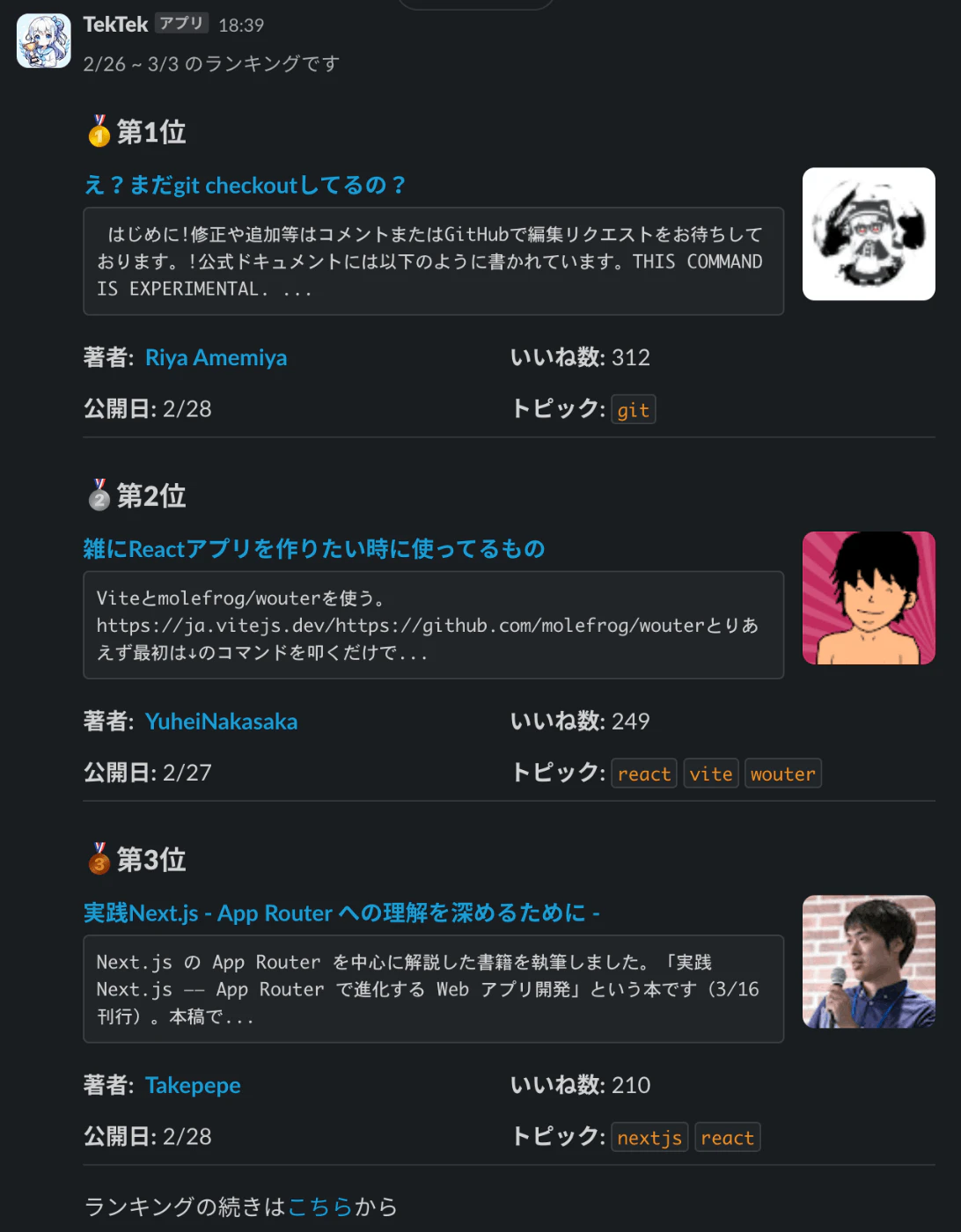 Slackにはランキングの上位3記事を投稿します