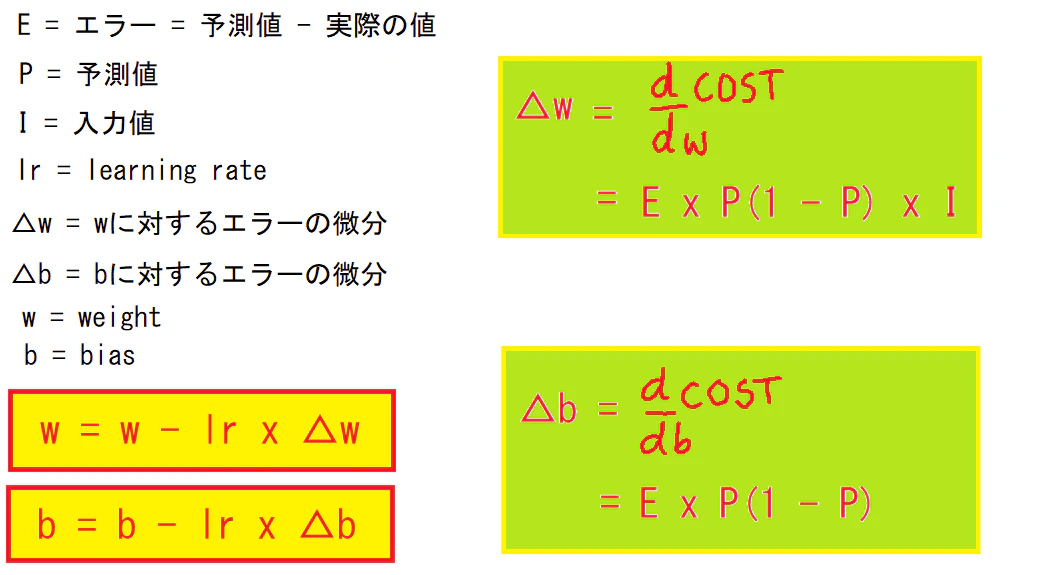 基礎なので具体的に書きませんが、weightとbiasの調整は以下の数式で行います。