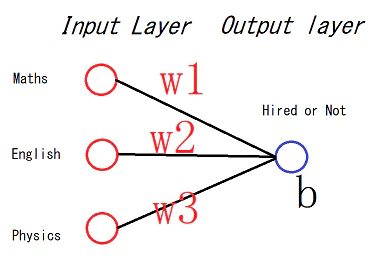Maths, English, Physics とは入力値であり決まってあります。w1,w2,w3,bは学習時に計算します。