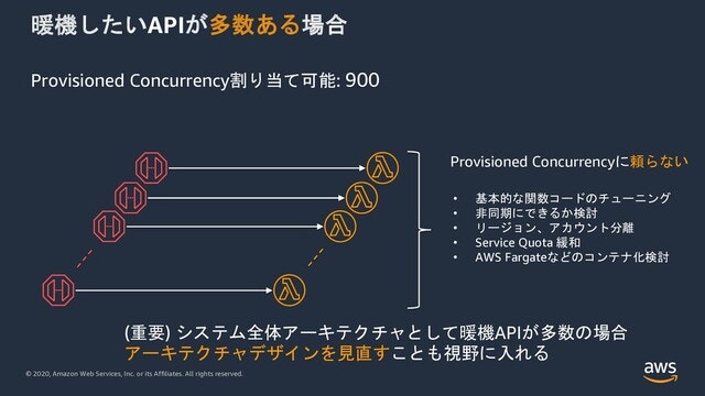 Provisioned Concurrencyを使わなくても、Lambdaはリクエストがくればマネージドにスケールします。その仕組みを活かしてアーキテクチャを設計しましょう。また、本当に暖機が必要な同期処理が必要かどうか常に非同期アーキテクチャの検討をしてください。