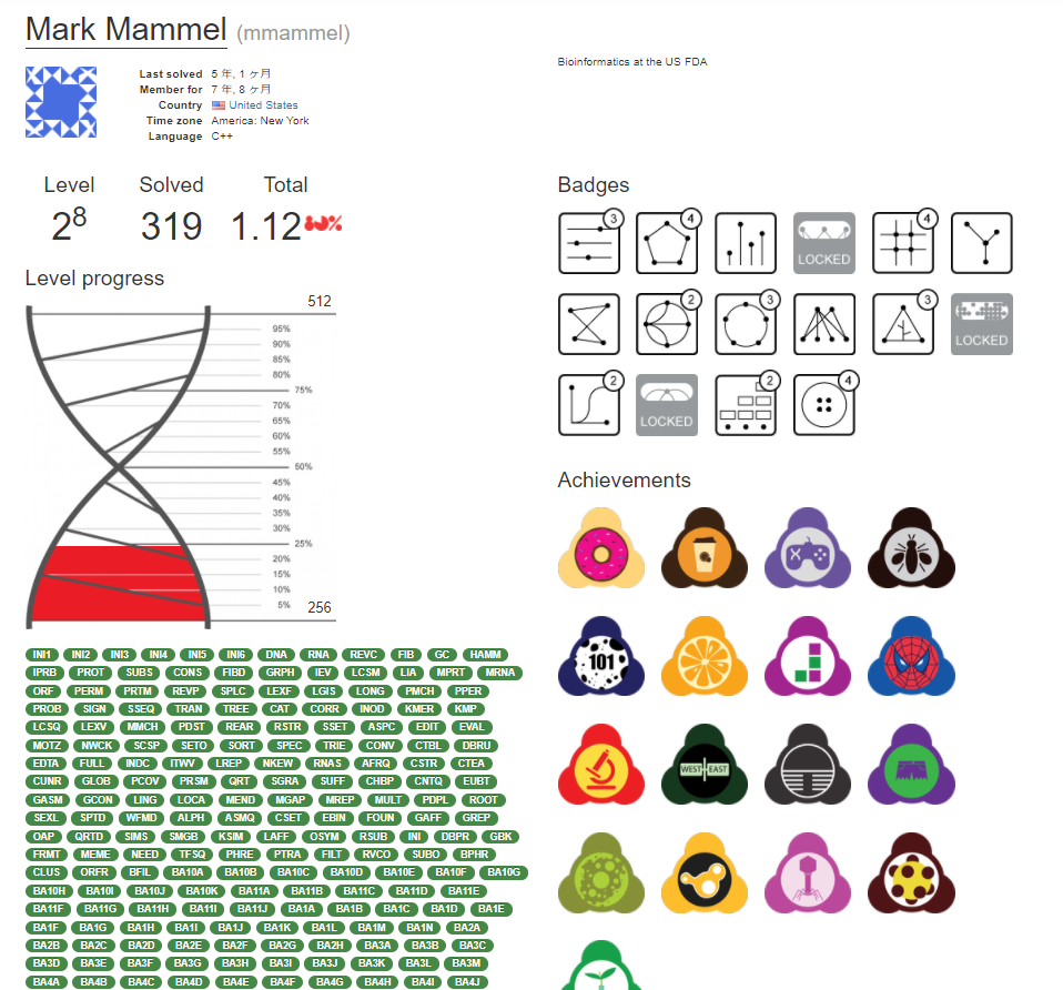 Rosalindでは問題を解くごとに(解いた問題数が2の階上に達するごとに)Levelが上がっていく仕組みがあります。また、特定の条件を満たすごとにBadgeやAchievementを獲得することができます。