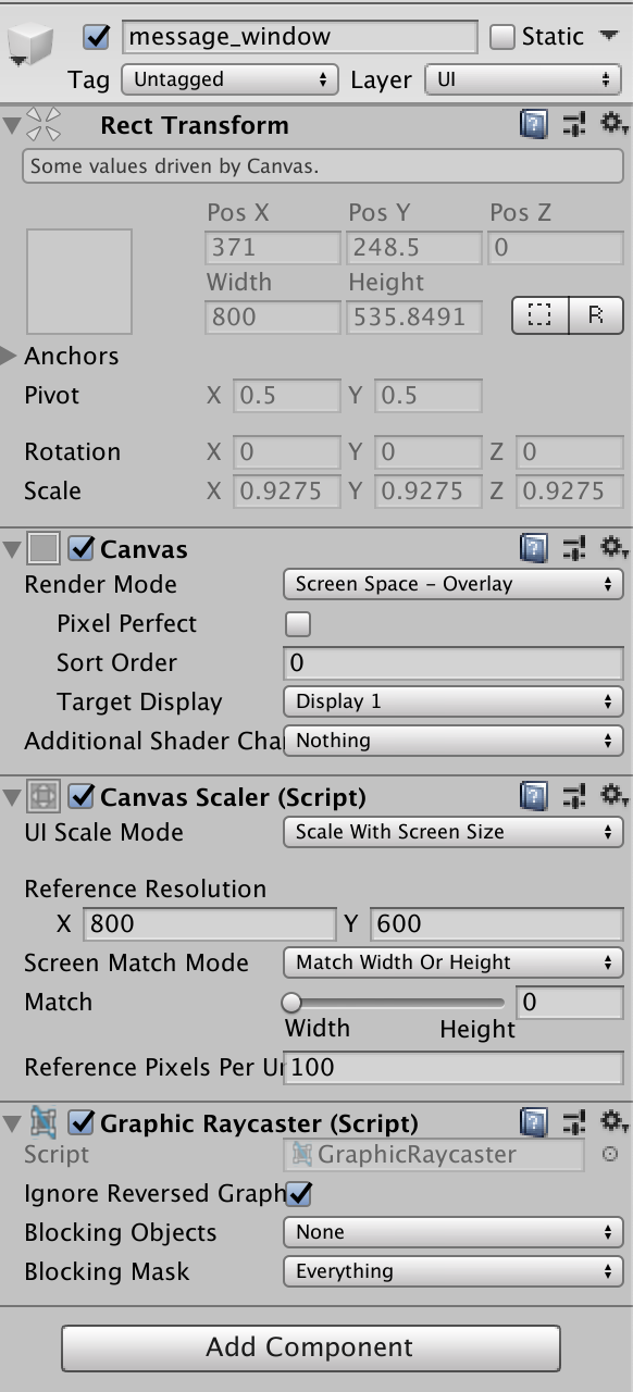 - UI Scale Mode -> Scale With Screen Size にする。これで、表示時にウインドウの大きさに合わせて子要素などの大きさがよしなに調整されます。