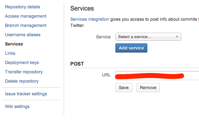 この設定をすると、bitbucketにpushする度に指定したURLにPOSTしてくれます