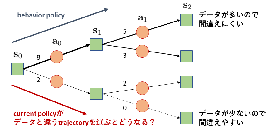 まず始めに $s_0$ の状態に対しbehavior policyは上の $a_0$ を主に選んでいたのに対し,current policyが下の $a_0$ を高い確率で選んでいた場合,エージェントの取った行動に応じて次の状態の観測されやすさが異なってきます.例えば,図ではbehavior policyによるデータ分布上では $s_1$ は上対下が8:2なのに対し,current policyでは上対下が4:6になるかもしれません.このように,方策の分布シフトにより引き起こされる,behavior policyの集めたデータ上とcurrent policyが取るはずのtrajectory上で状態遷移確率やデータ生成確率が異なることを,状態の分布シフトと呼びます.