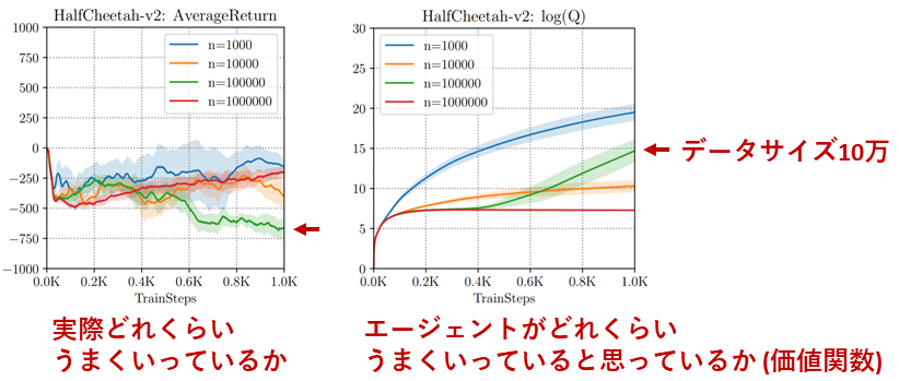 特に緑のデータサイズ10万の時に注目してみると,そもそも性能が非常に悪いだけでなく学習すればするほど性能が悪化してしまっているのが分かります.ではその時エージェントがどれくらいうまくいっていると思っているか?を右図の価値関数をもとに見てみましょう.すると,このエージェントは学習を重ねるごとにどんどんその価値関数が上昇しています.つまり,緑のエージェントは自分では学習がうまくいっていると思っている一方で,実際には全然うまく学習できていない,という状況が起こっています.
