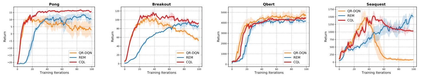 このように,CQLではデータが得られている部分に対してはなるべく価値を大きく正当に評価し,一方でデータのない不確実性の高い部分に対しては価値を低く見積もることで,過大評価を抑制しつつも価値をうまく近似しようとしているのが分かります.また,CQLは価値の推定下界を最大化する方策を獲得できることが理論的に証明されています.(詳しくは論文参照)