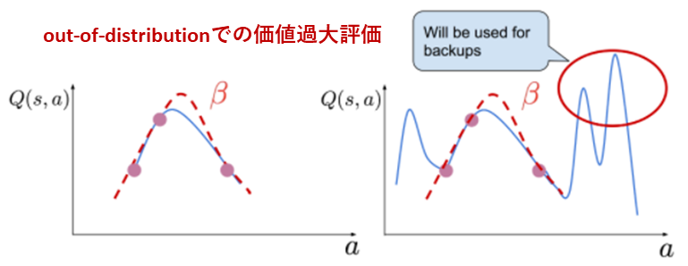 - TD学習でtargetとして誤差を取る右辺の部分で,データ上で記録された行動だけでなくout-of-distributionな $(s_{t+1}, a_{t+1}^{\prime})$ に対しても価値を算出する必要があるが,ここで過大評価が起こるとエラーが逆伝播してしまう.
