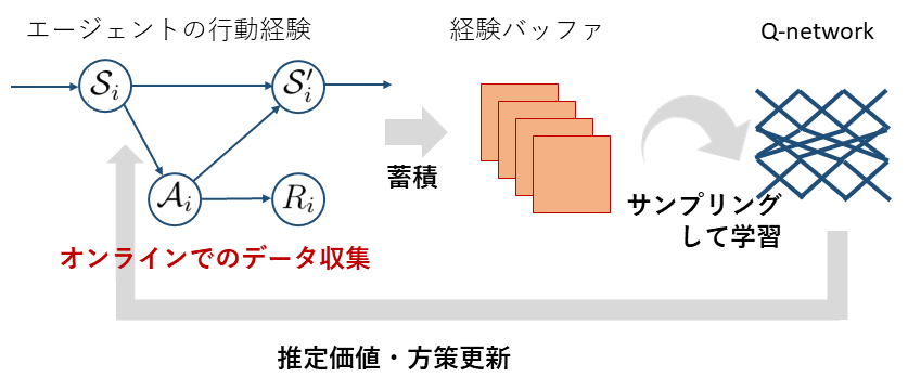 - 現在の方策に基づいて環境とインタラクションし,得られたフィードバックを含む行動記録 $(s_t, a_t, s_{t+1}, r_t)$ を経験バッファに追加・蓄積.
